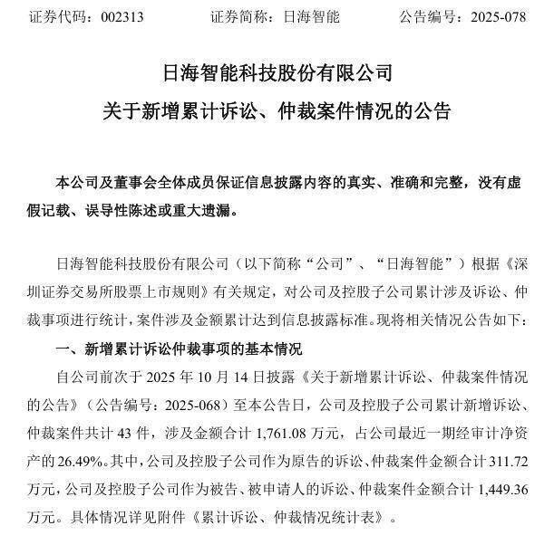 12月1日,日海智能(002313)发布公告,自公司前次于2025年10月14日披露公告至本公告日恒盛优配,公司及控股子公司累计新增诉讼、仲裁案件共计43件,涉及金额合计1761万元,占公司最近一期经审计净资产的26.49%。