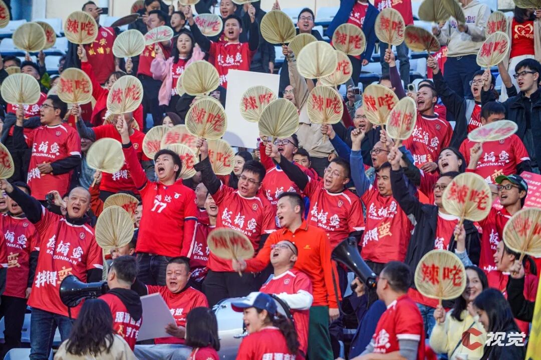 10月26日,广安板楯蛮队的球迷手持写有“辣咤”的蒲扇为球队加油助威 图据川观新闻