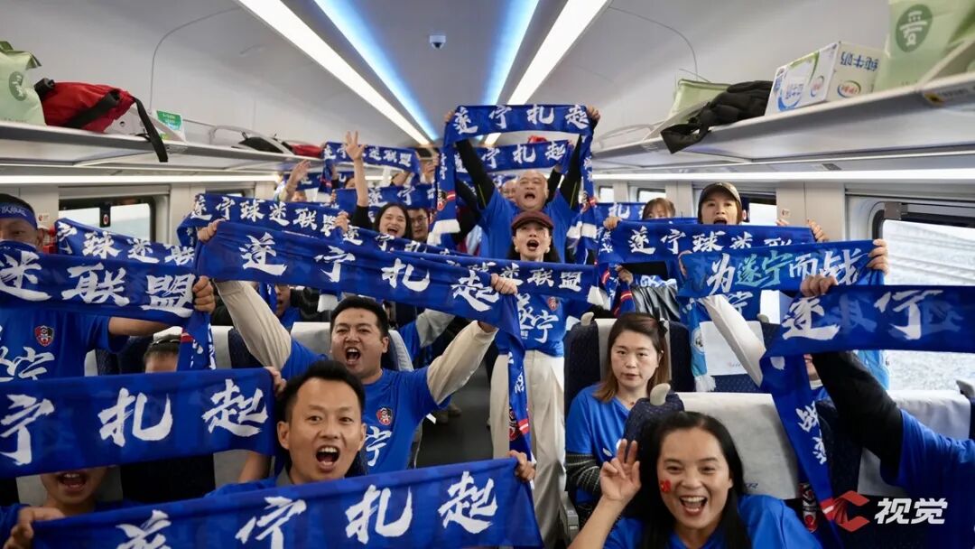 10月19日,遂宁火车站喊声阵阵,1100余名遂宁舍得干队的球迷整队集合,有序搭乘球迷专列前往达州为球队加油 图据川观新闻