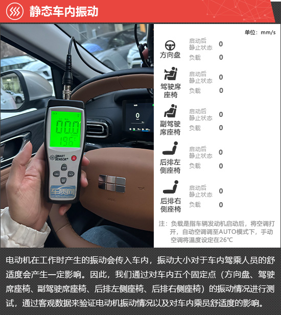 在静态车内振动测试环节,启动后静止和负载两种状态下,评测车所有测试位置在两种状态下的振动数值均为0,表现非常出色。