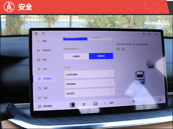 评测车支持L2级辅助驾驶,具备车道保持辅助系统、车道居中保持、道路交通标识识别等辅助功能。实测开启辅助驾驶后,跟车距离较远,较易被其他车辆加塞;红绿灯起步车辆无法自行跟随,需要驾驶者主动操作,整体能力相对基础。
