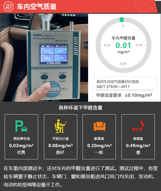 在车内空气质量测试环节,将车辆放置在车辆较少的内部地面停车场中,实测2026款吉利银河星耀6的车内甲醛含量为0.01mg/m3,符合2012年3月1日起实施的,由原环保部和国家质量监督检验检疫总局联合发布的《乘用车内空气质量评价指南》(中华人民共和国国家标准GB/T 27630-2011)中的相关标准。