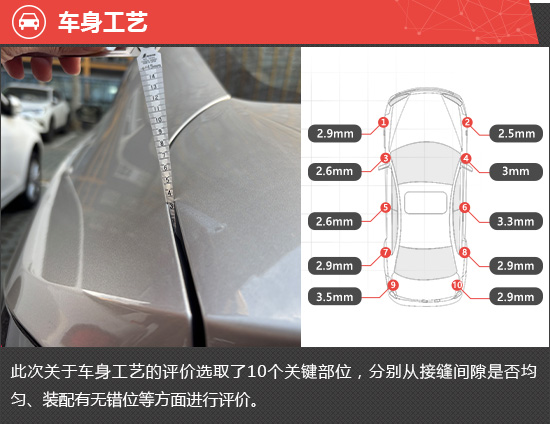 在车身工艺测试环节,整车共选取10个关键部位,每个关键部位都会选取3个关键点进行测量,以评价各关键部位缝隙的均匀程度。从测试结果来看,评测车所有关键部位的缝隙均值处于合理范围内,且左右缝隙均值相差不大,车身工艺表现可圈可点。